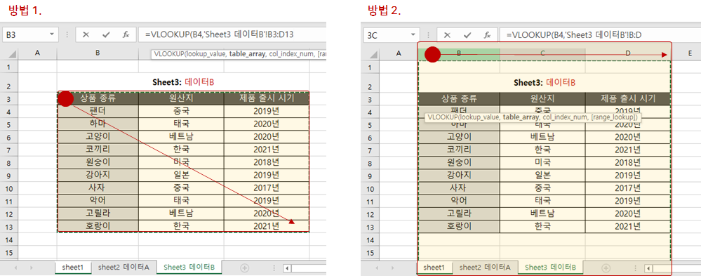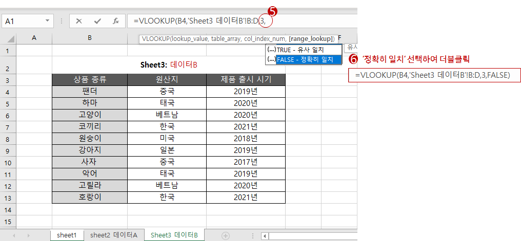 sheet3(데이터B) 에서 '제품 출시 시기'를 가져오는 법