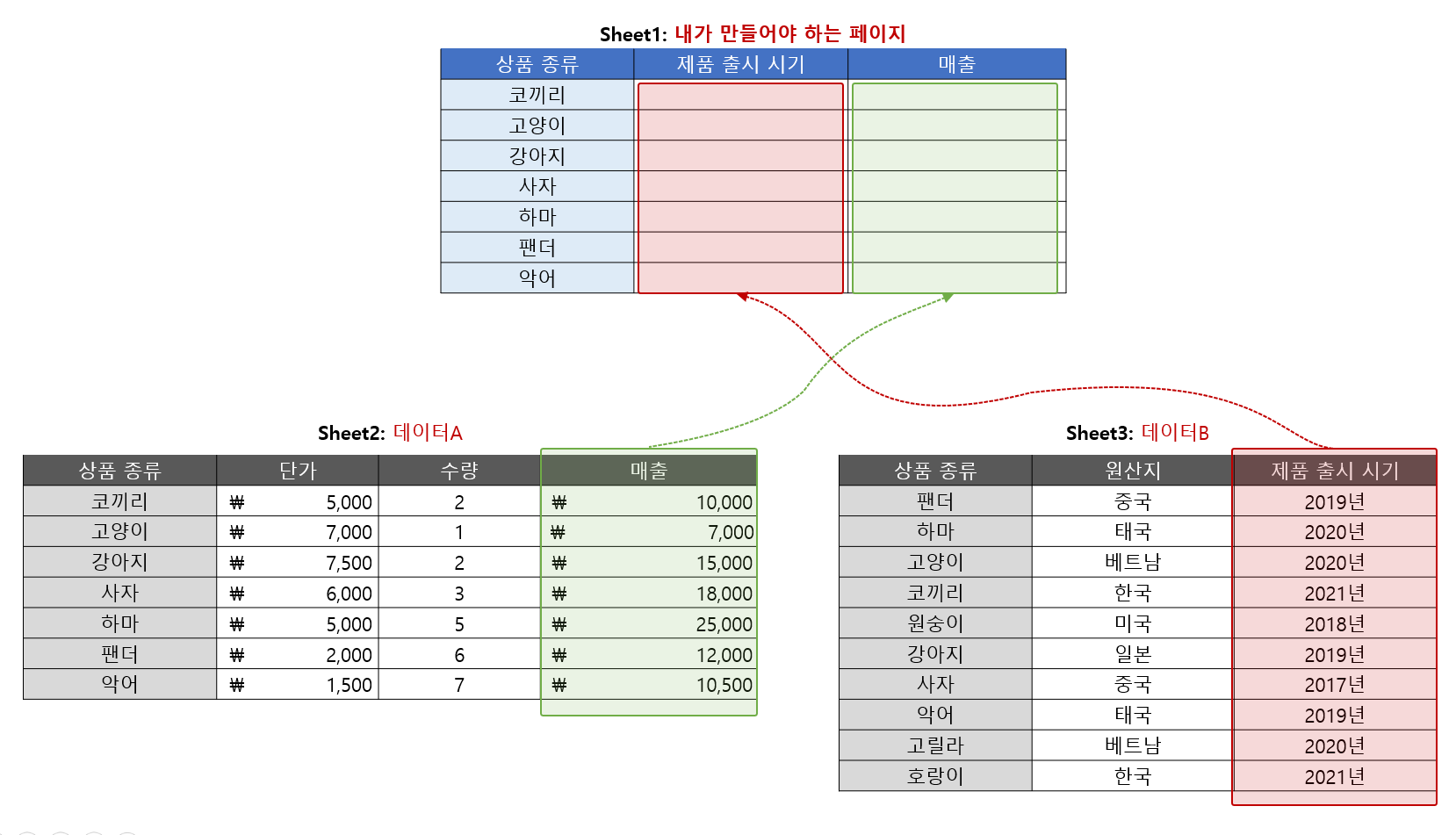 Sheet1은 흩어져 있는 데이터를 모아와서 보여줄 페이지