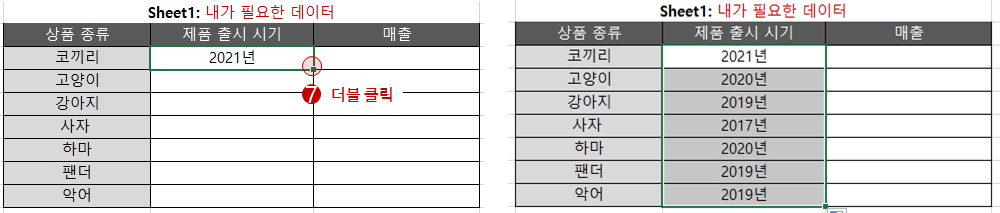 오른쪽 아래 모퉁이를 더블클릭하거나 아래로 쭉 드래그 하면 나머지 데이터도 채워진다